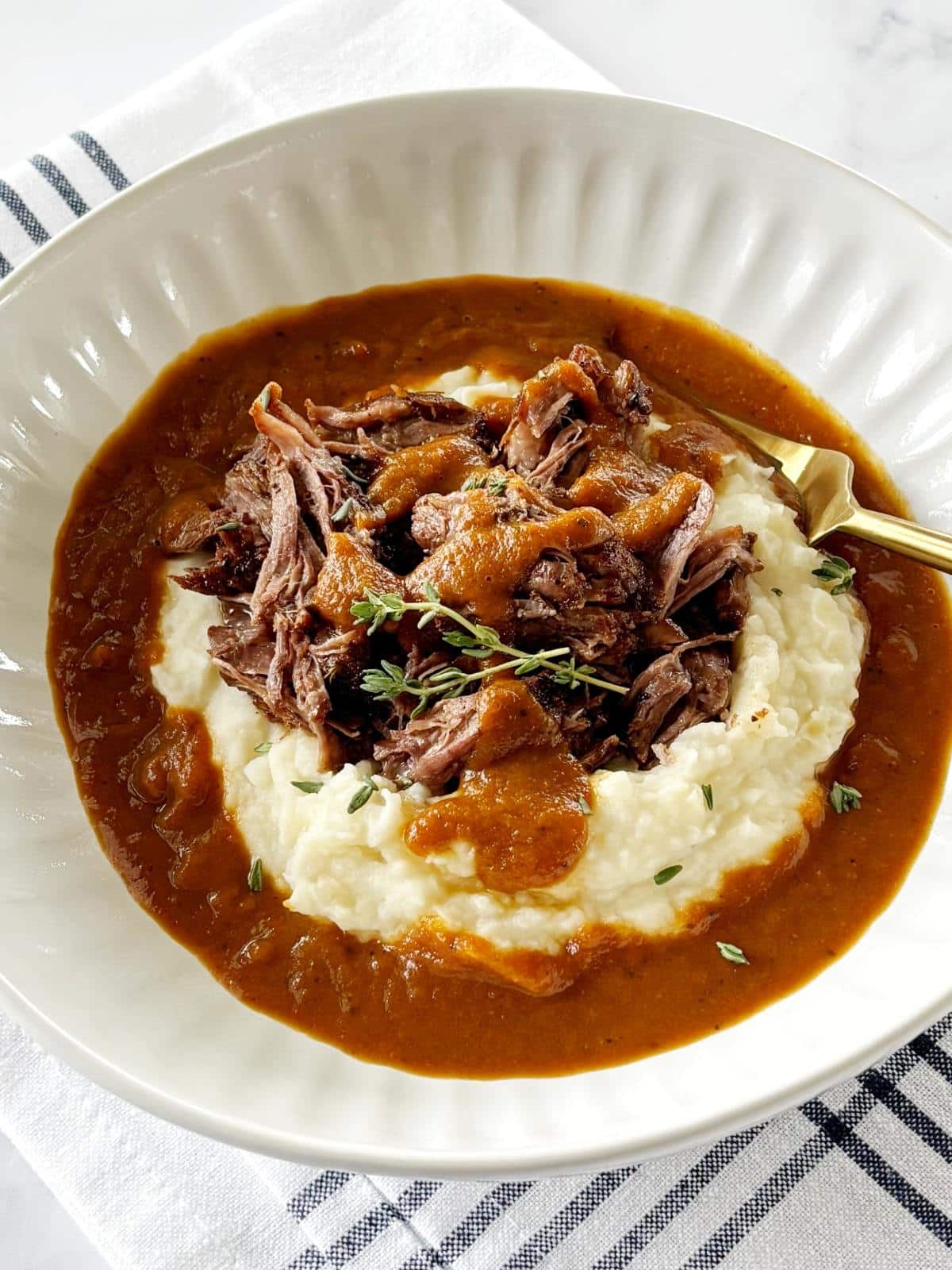 Growing up, my mom didn’t cook much. Most nights it was a TV dinner, or maybe some fish sticks and Kraft mac and cheese. But she did make a mean pot roast. It was the classic crock-pot version with dried French onion soup mix, cream of mushroom soup, carrots, and potatoes. We loved it so much that my brother’s dog once poached an entire Tupperware full off his counter while my mom was visiting him in college.